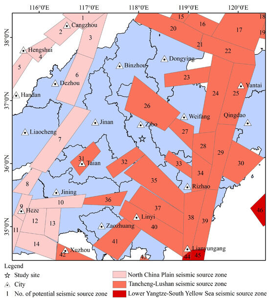 Based on the fifth-generation seismic ground motion parameter zoning scheme, the study area (extended 200 km from the study site) was influenced by the Tancheng–Lushan seismic source zone, the Lower Yangtze–South Yellow Sea seismic source zone, and the North China Plain seismic source zone. These three source zones encompass 28, 4 and 14 potential seismic source zones, respectively, totaling 46 potential seismic source zones, as shown in Figure 6.