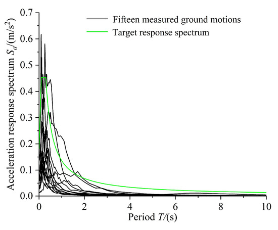 Due to the high lateral stiffness of the bridge, this study only considered longitudinal ground motion input. Fifteen measured ground motions were selected based on the target response spectrum, as listed in Table 9, with their acceleration response spectrum shown in Figure 7. These ground motions were carefully selected to be representative of the seismic hazard at the site, encompassing a range of magnitudes and source-to-site distances. The PGA of the measured ground motions was adjusted to 20 groups with intervals of 0.05 g, ranging from a minimum of 0 to a maximum of 1.0 g. The natural ground motions are amplitude-scaled to these values, resulting in a total of 300 ground motion records.