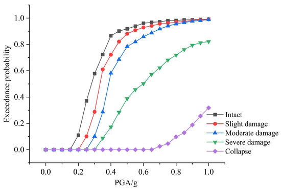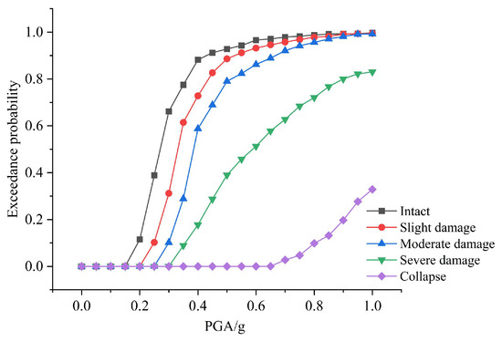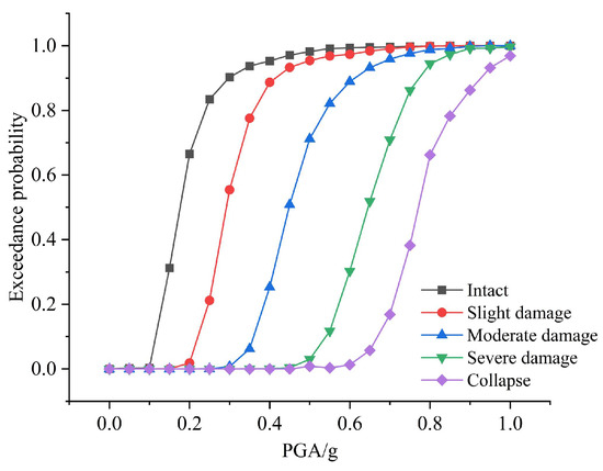 As shown in Table 12, Table 13, Table 14 and Table 15, under the same PGA levels, the seismic damage of the side piers is more severe than middle piers. Therefore, only the side piers and their bearings were considered in the probability risk assessment. According to the results of the IDA, for the bridge piers, the parameters are β = 0.8567, d1 = 1.082 and d2 = 0.995, for the bearings, the parameters are β = 0.8353, d1 = 76.853, and d2 = 0.99.
