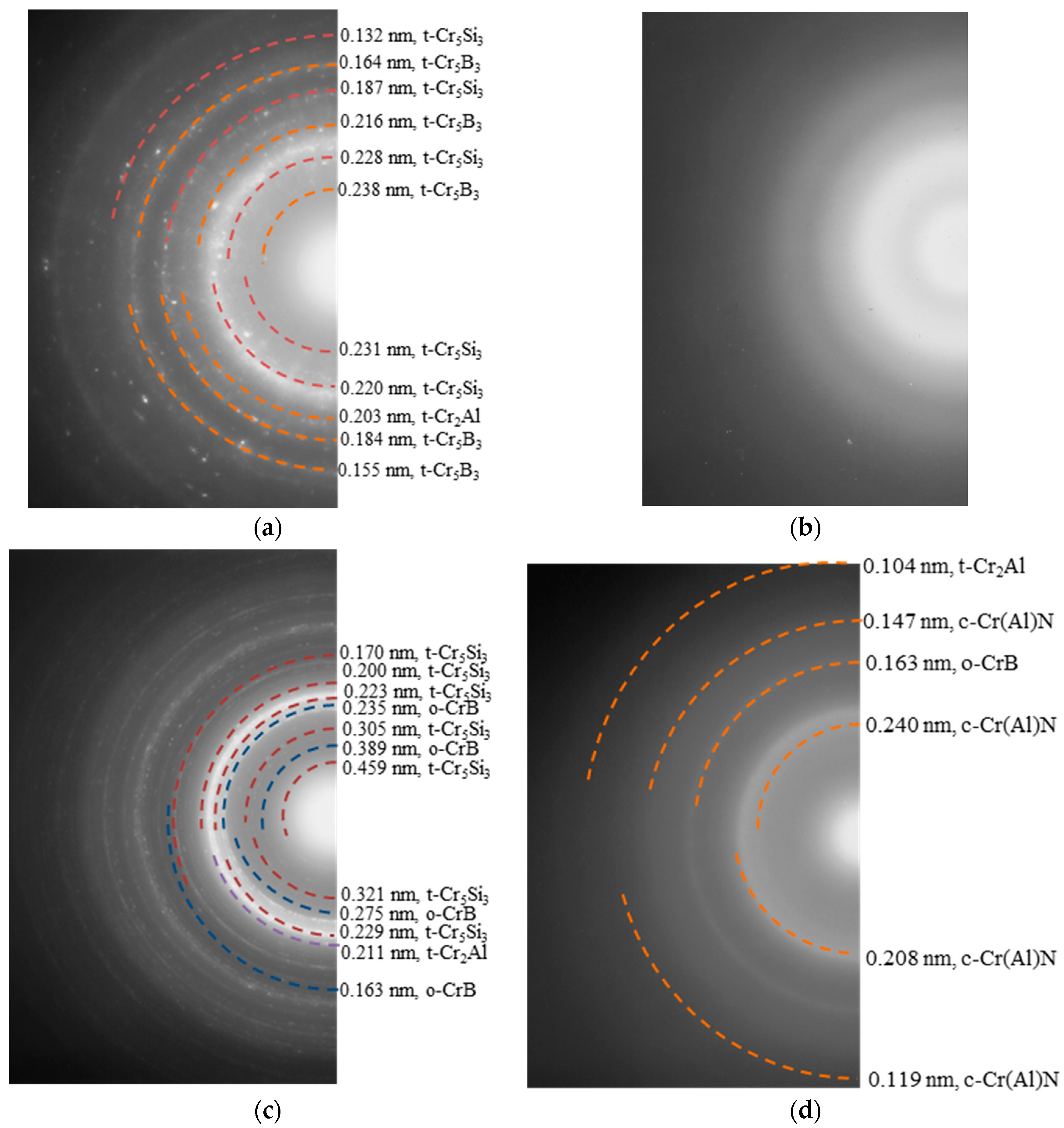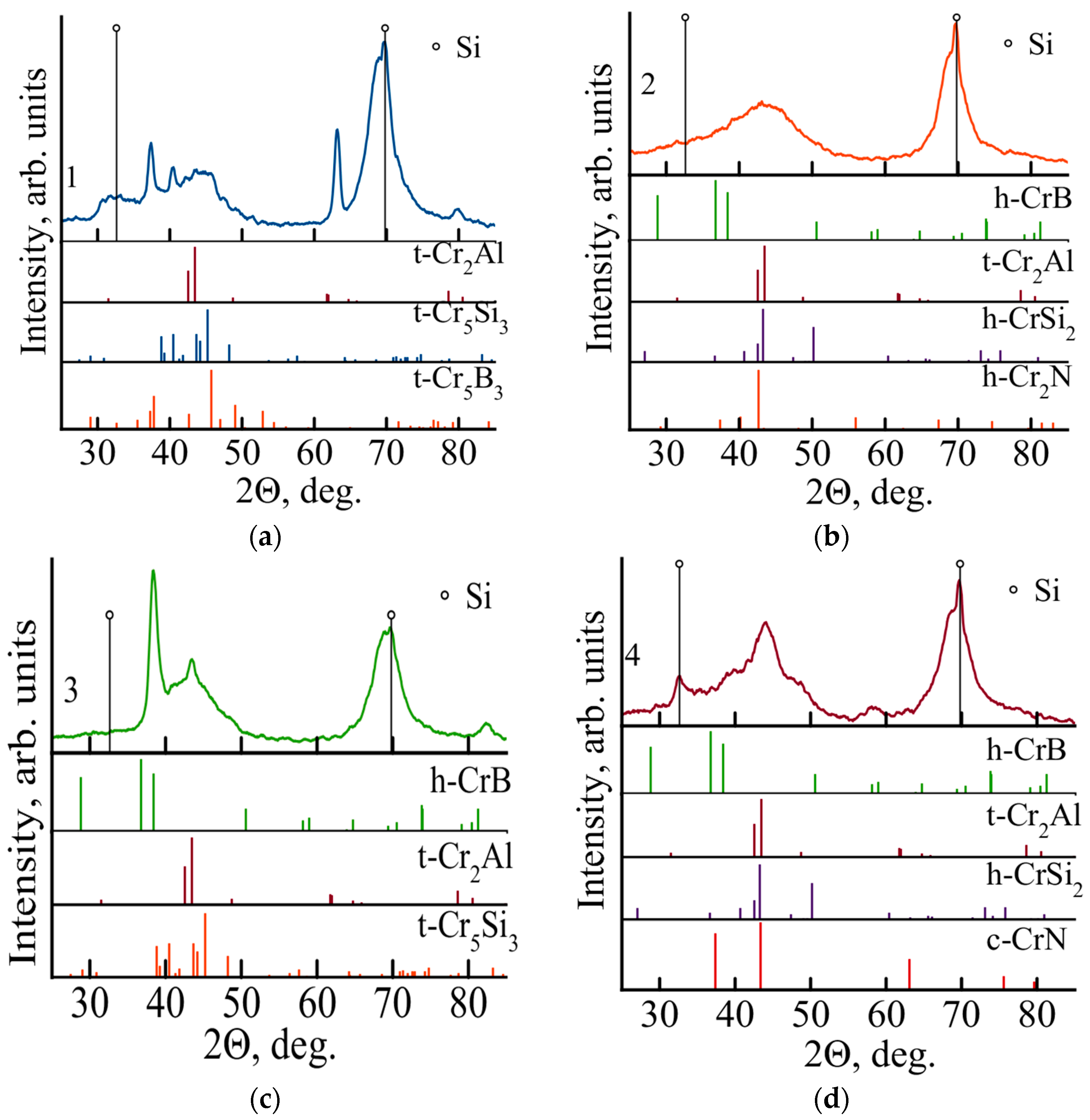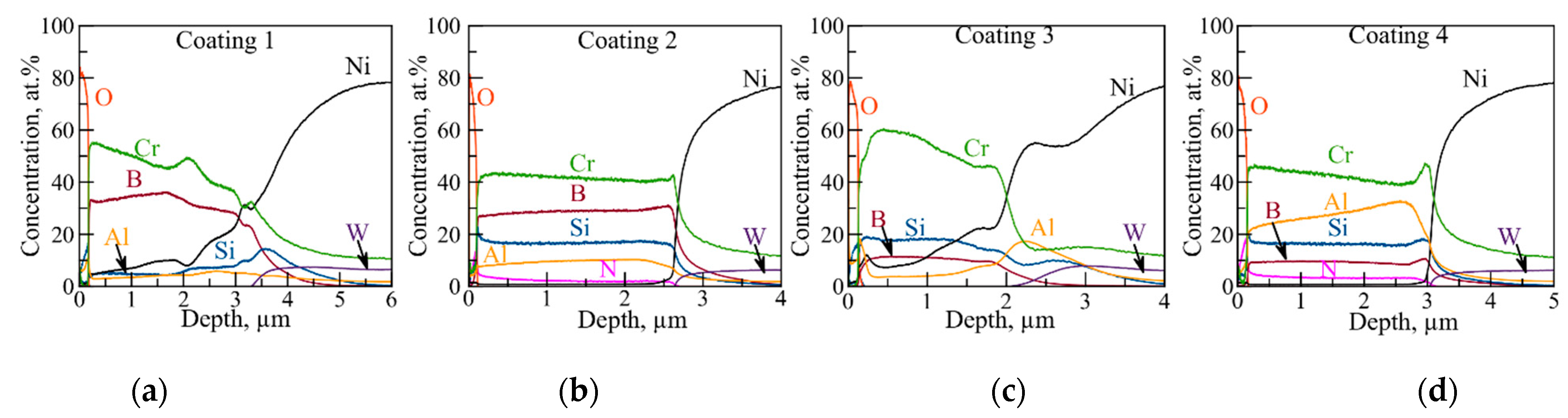 - Kiryukhantsev-Korneev, P.V.; Pierson, J.F.; Bauer, J.P.; Levashov, E.A.; Shtansky, D.V. Hard Cr–Al–Si–B–(N) Coatings with Oxidation Resistance up to 1200 °C. Glass Phys. Chem. 2011, 37, 411–417. [Google Scholar] [CrossRef]