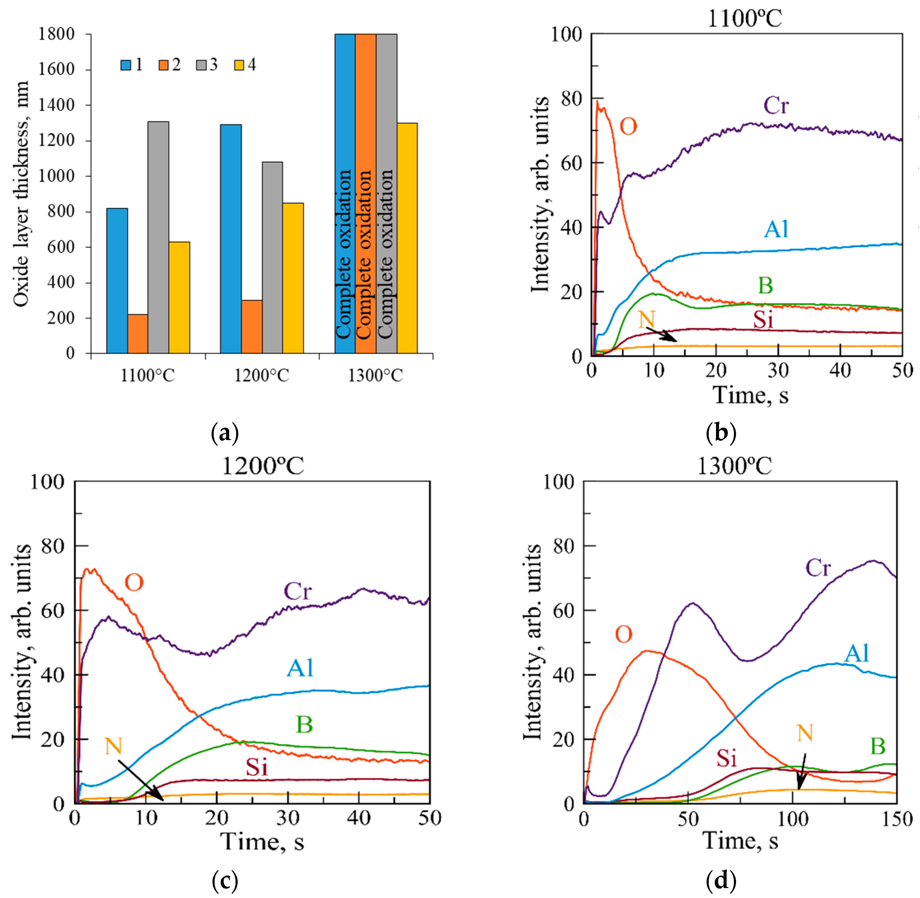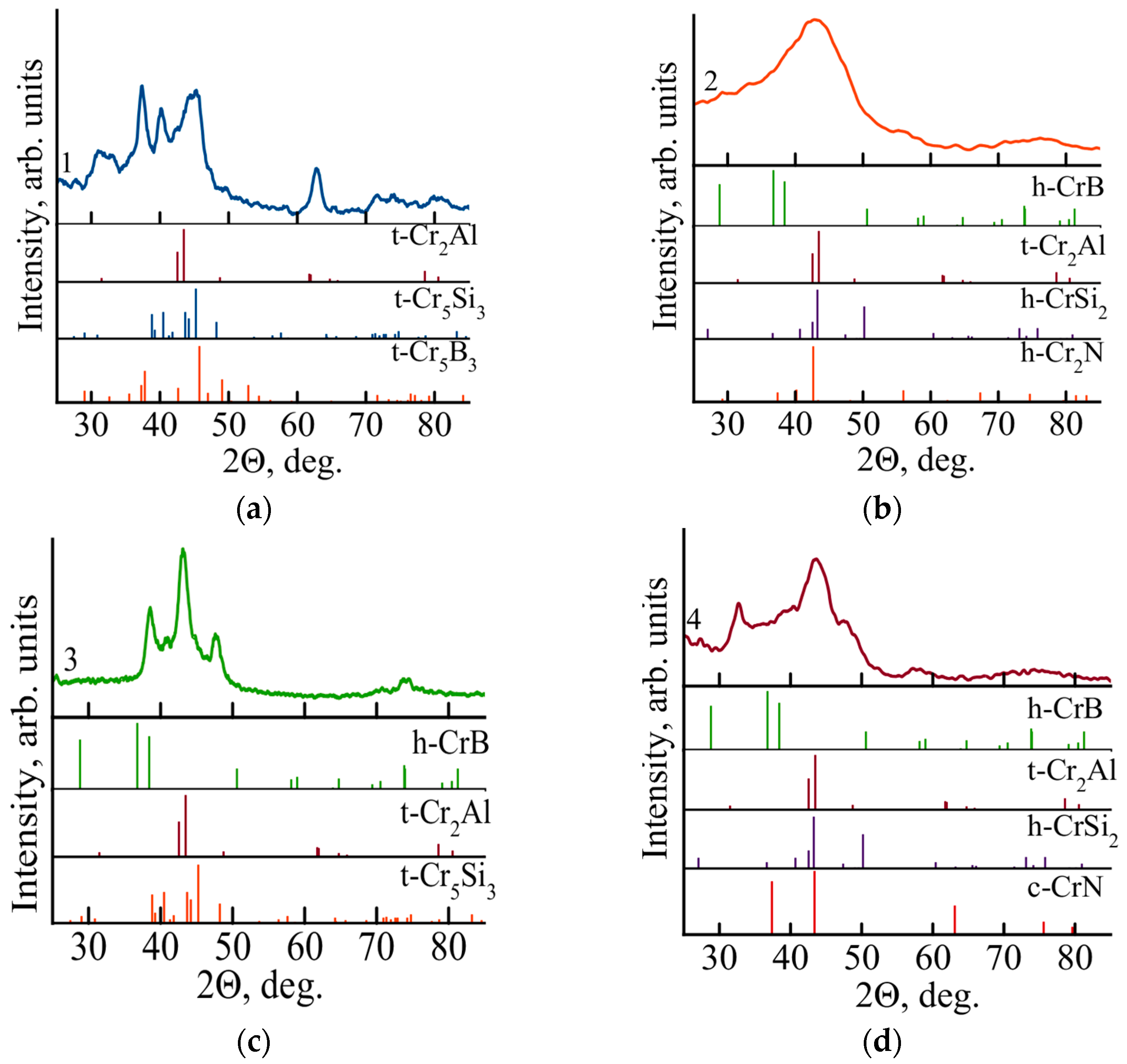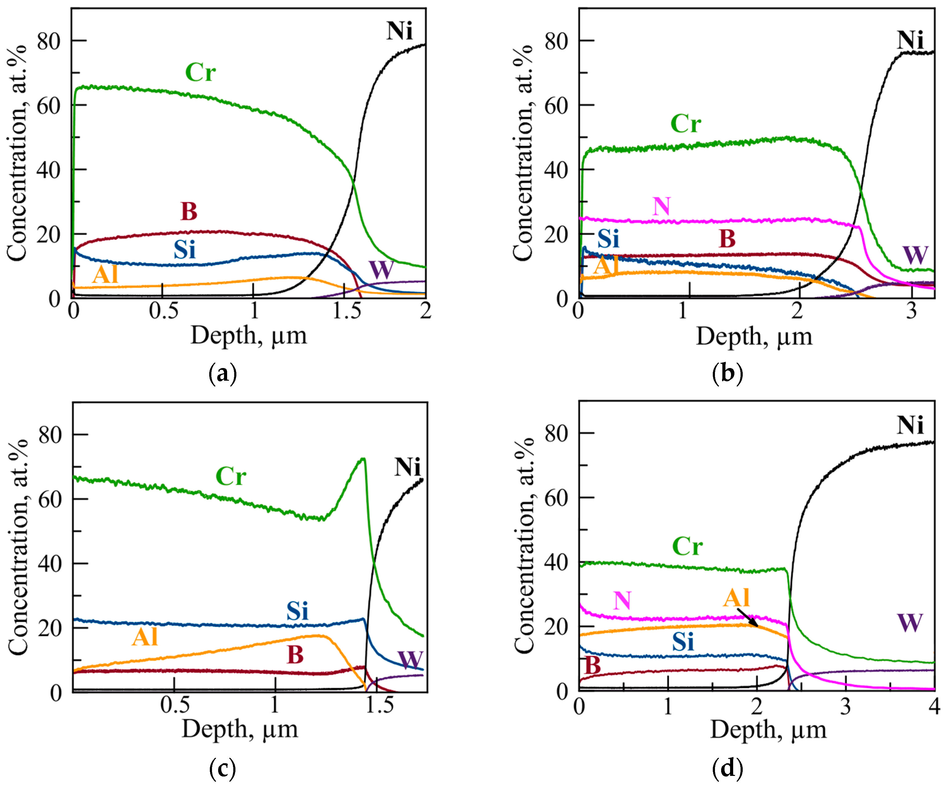 - Kiryukhantsev-Korneev, P.V.; Pierson, J.F.; Bauer, J.P.; Levashov, E.A.; Shtansky, D.V. Hard Cr–Al–Si–B–(N) Coatings with Oxidation Resistance up to 1200 °C. Glass Phys. Chem. 2011, 37, 411–417. [Google Scholar] [CrossRef]