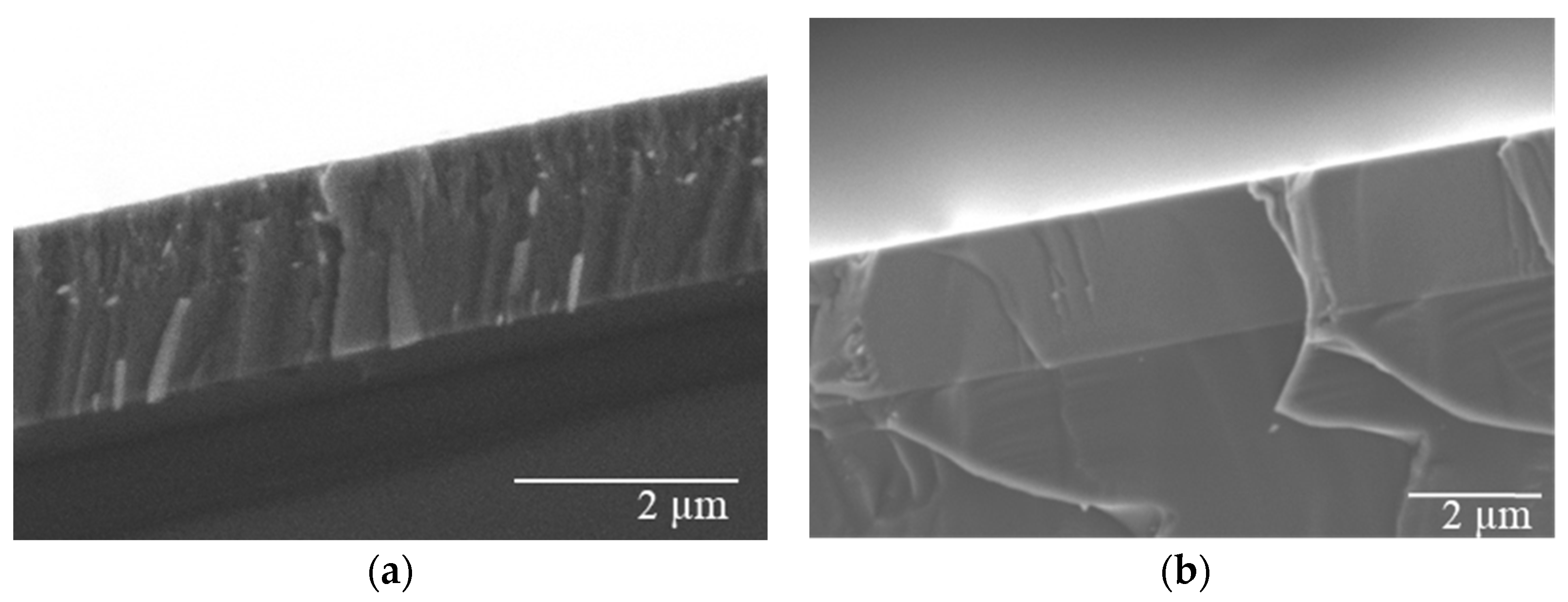 - Hübner, R.; Hecker, M.; Mattern, N.; Voss, A.; Acker, J.; Hoffmann, V.; Wetzig, K.; Engelmann, H.-J.; Zschech, E.; Heuer, H.; et al. Influence of nitrogen content on the crystallization behavior of thin Ta–Si–N diffusion barriers. Thin Solid Film. 2004, 468, 183–192. [Google Scholar] [CrossRef]