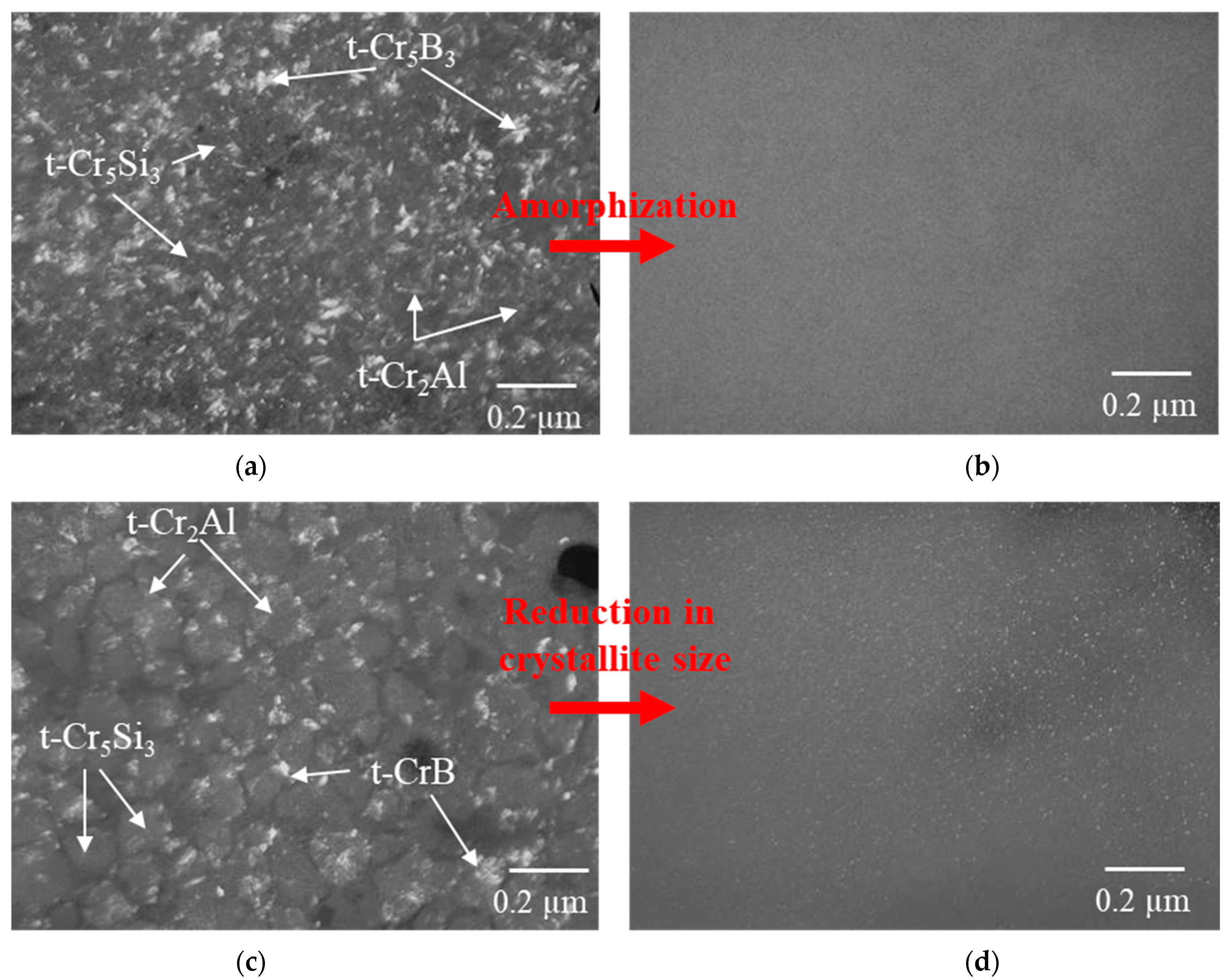 - Li, K.Q.; Chen, L.; Hu, C.; Zhang, J.; Du, J.W. Structure, mechanical and thermal properties of CrAlBSiN coatings prepared by cathodic arc evaporation. Surf. Coat. Technol. 2023, 452, 129094. [Google Scholar] [CrossRef]