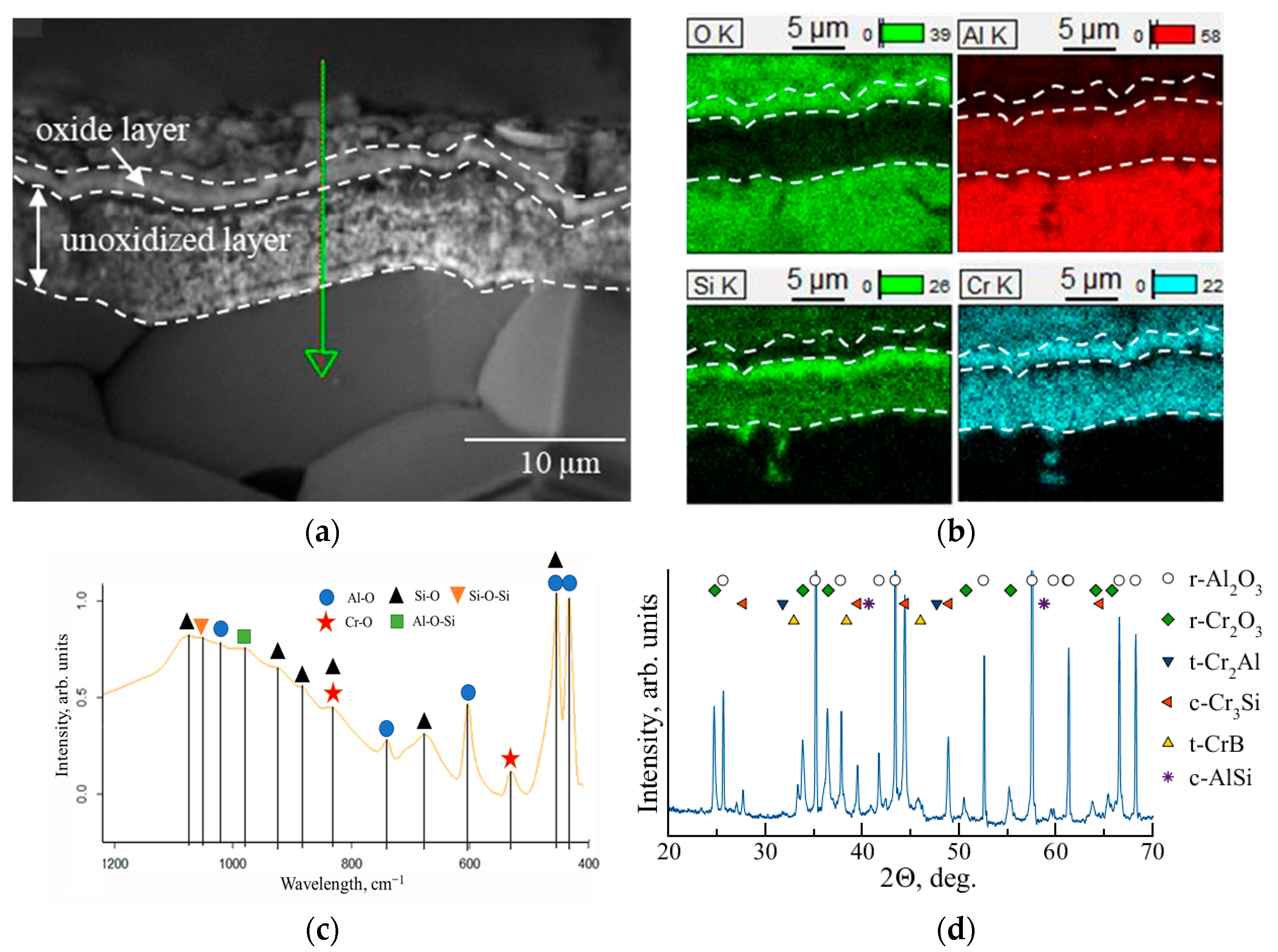 - Pogozhev, Y.S.; Potanin, A.Y.; Levashov, E.A.; Kovalev, D.Y. The features of combustion and structure formation of ceramic materials in the Cr–Al–Si–B system. Ceram. Int. 2014, 40, 16299–16308. [Google Scholar] [CrossRef]