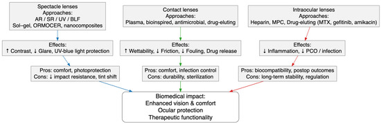 Conceptual diagram summarizing coating materials and functional approaches across spectacle, contact, and intraocular lenses, showing their main effects, advantages, limitations, and biomedical relevance.