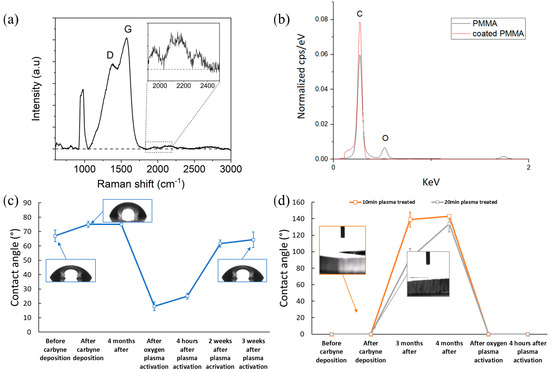 (a) Raman spectra of the carbyne-enriched film deposited on a silicon substrate. The inset plot shows the region-specific -C≡C- bonds. (b) EDX spectra of rough PMMA treated for 20 min, before and after carbyne coating, highlighting the increase in carbon content and the coverage of oxygen after the carbyne-enriched coating. (c) Contact angle measurements on flat PMMA plate before and after the carbyne-enriched coating, and after oxygen plasma activation of the surface. Images of water droplet on a flat PMMA surface before and after 40 nm of carbyne-enriched coating for display purposes. (d) Contact angle measurements on rough PMMA plate before and after the carbyne-enriched coating, and after oxygen plasma activation of the surface. Images of the droplets placed on rough PMMA surfaces coated with carbyne-enriched coatings are also shown. Note that for the 20 min-treated surface, the water formed a really thin film while for the 10 min-treated, the water formed a thicker one.