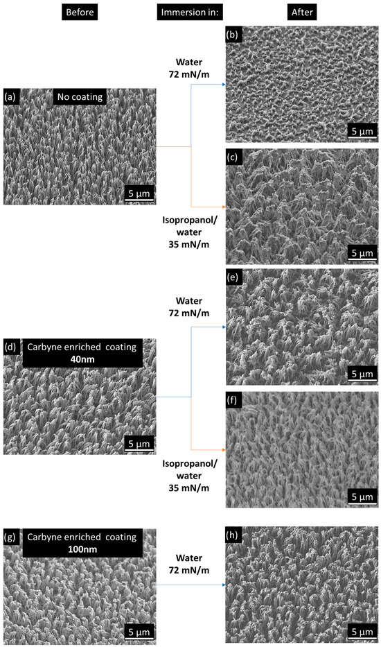 After evaluating the mechanical durability of superhydrophilic surfaces, the durability of superhydrophobic surfaces coated with carbyne was also tested. The key factor that imparts extreme water repellency to these surfaces is the addition of a thin 40–50 nm Teflon-like coating obtained through C4F8 plasma deposition. Indeed, water surface contact angles were measured extremely high at 165 ± 3°, while contact angle hysteresis was extremely low <5°. To induce wetting on such surfaces, a mixture of isopropanol/water 18% v/v was used. The corresponding SEM images after wetting (Figure 3c,f) reveal that in the case of the carbyne-coated surface, the micro- and nanostructures can withstand the durability test of wetting using the low surface tension liquid and remain intact (Figure 3f). On the contrary, the structures of the superhydrophobic surface without a carbyne-enriched coating aggregate and coalesce after wetting (Figure 3c), reducing the roughness and height.