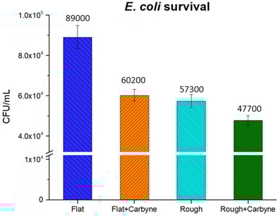 E. coli viability on plain (flat), carbyne-enriched coated (flat + carbyne), micro-nanotextured (rough), and micro-nanotextured and carbyne-enriched coated (rough + carbyne) PMMA surfaces, after 4 h incubation time. The carbyne-enriched coating shows moderate antibacterial activity, similar to the one on the micro-nanotextured PMMA surfaces, while the additionally micro-nanotextured and carbyne-enriched coated surfaces exhibit an enhanced killing effect.