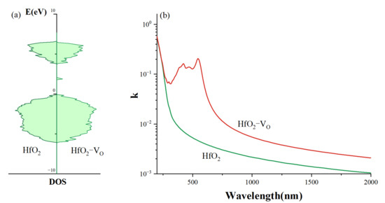 During the preparation of HfO2 thin films using either the EBE or PAD methods, it is common for the films to exhibit an amorphous structure [1,20]. Molecular dynamics simulations were conducted to generate an amorphous structure model of the HfO2 thin film. To simulate the optical effects of VO in the HfO2 film, one oxygen atom was intentionally removed, resulting in a VO concentration of 1/64, as illustrated in Figure 1. Density functional theory calculations were employed to investigate the electronic density of states for both the HfO2 thin films with and without VO, as shown in Figure 2a. The complex dielectric constant was determined from the electronic structure calculations, and the extinction coefficients of the models were calculated using the formula: