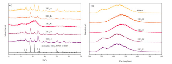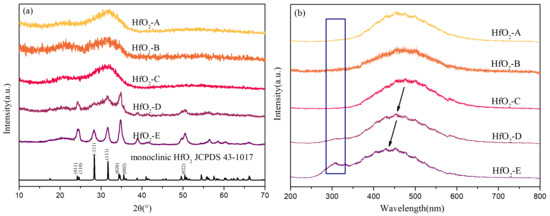 (a) XRD measurement results of HfO2 samples, with the reference diffraction pattern for monoclinic HfO2 (JCDS 43-1017), and (b) fluorescence emission spectra of HfO2 samples.