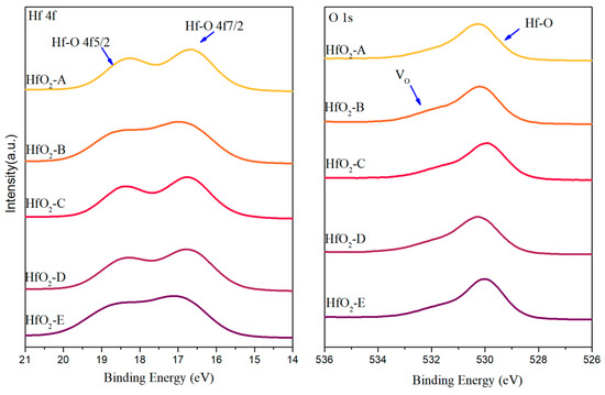 Figure 5 presents the Hf 4f and O 1s core-level spectra of the samples. The Hf 4f spectrum typically exhibits a characteristic doublet with binding energies of approximately 16.8 eV (4f7/2) and 18.5 eV (4f5/2), The as-deposited HfO2-A, C, D samples display Hf 4f peaks that closely align with the characteristic values [33], indicating predominantly Hf4+ states and near-stoichiometric composition. In contrast, HfO2-B and HfO2-E exhibit Hf 4f peak shapes that deviate from the standard doublet pattern. This deviation suggests the presence of different oxidation states of hafnium, including Hf3+, Hf2+, or possibly metallic Hf0 species, confirming that these films contain sub-stoichiometric hafnium oxide phases. The O 1s spectra provide complementary information regarding oxygen chemical environments and vacancy concentrations. The O 1s region can be deconvoluted into lattice oxygen in Hf-O bonds (centered around 530.5 eV) and VO (centered around 532.0 eV) [33]. HfO2-B exhibits a significant VO peak, corroborating the interpretation that its high optical absorption stems from substantial oxygen deficiency. Conversely, HfO2-A and HfO2-C display weaker VO signals, consistent with their lower absorption values.