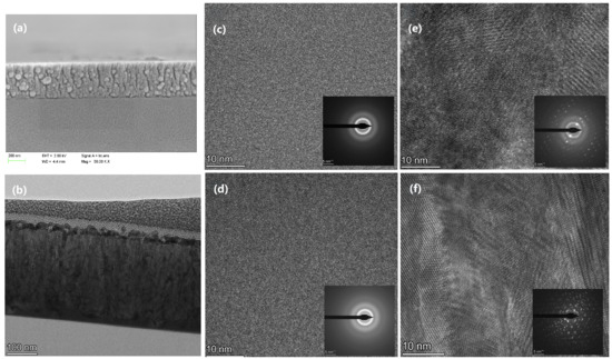 The cross-sectional structures of the samples were examined using a SIGMA HD scanning electron microscope (SEM) from Zeiss. Cross-sectional slices were prepared using a Thermo Scientific Helios 5 CX focused ion beam (FIB), and transmission electron microscopy (TEM) images were obtained with the Talos F200S G2 device. Selected area electron diffraction (SAED) patterns were obtained during TEM analysis to definitively distinguish between amorphous and crystalline structures.