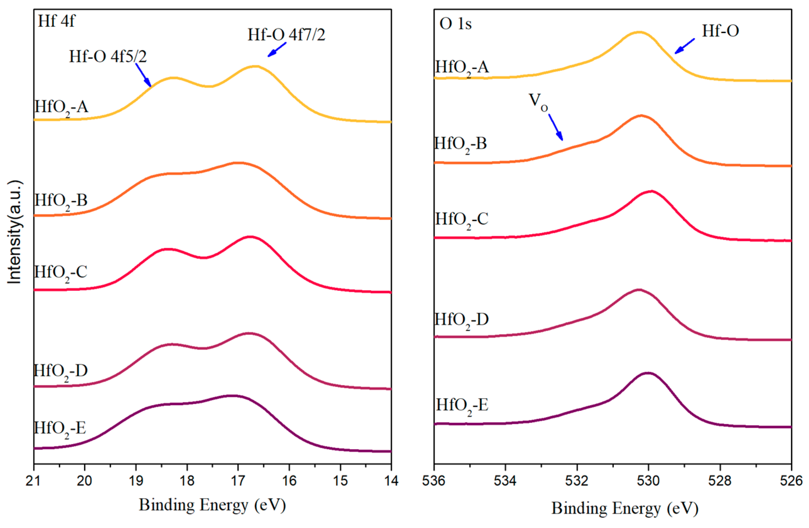 O peak intensity decreases substantially, confirming that the dramatic reduction in optical absorption (from 913.2 ppm to 29.3 ppm) results from re-oxidation that compensates for the initial oxygen deficiency. This re-oxidation effect outweighs the defect generation associated with the crystallization observed in XRD. Conversely, HfO