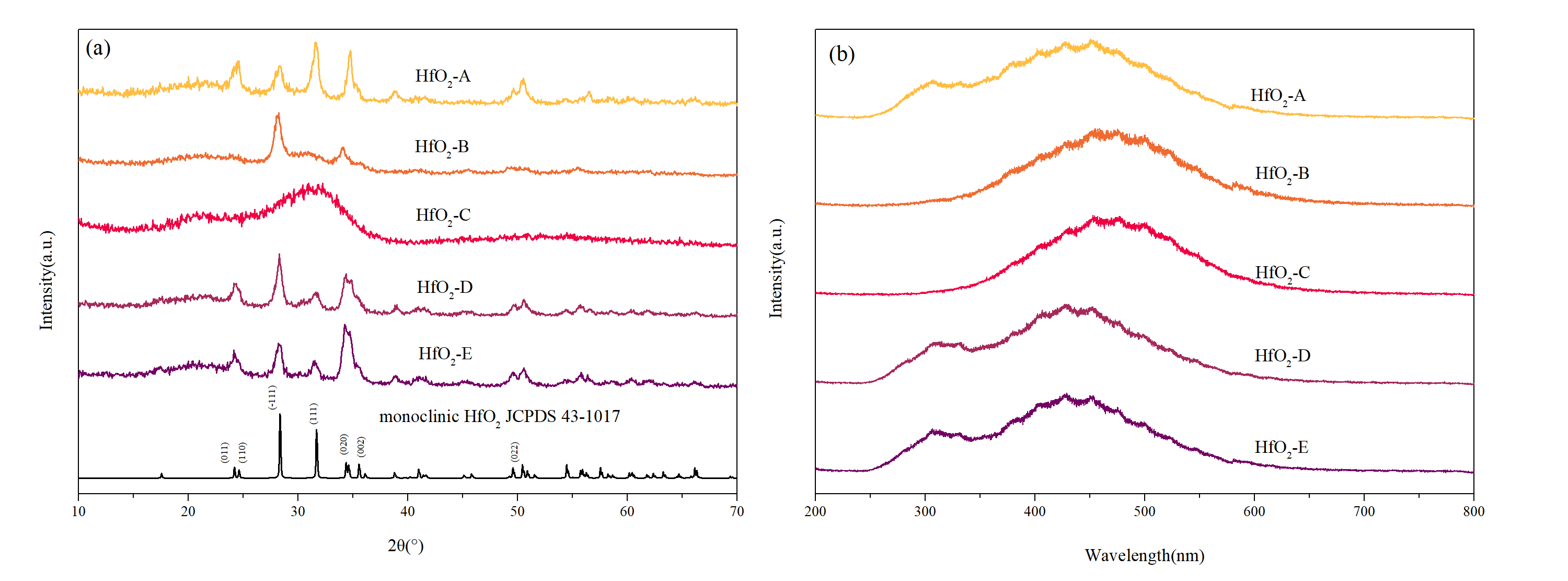 Analysis of the XRD curves and fluorescence emission spectra reveals that HfO2-A, -B, and -C exhibit an amorphous structure, with their fluorescence emission peak appearing as a broad peak centered around 480 nm. This broad peak may be attributed to the superposition of several fluorescence emission peaks resulting from radiative transitions of excited electrons to various lower energy levels. The crystalline grains present in HfO2-D and -E lead to the emission peak shifting toward shorter wavelengths, indicating that the monoclinic-phase HfO2 grains exhibit stronger fluorescence emission peaks at shorter wavelengths under 193 nm light excitation. As a result, these peaks overlap with the fluorescence emission peaks of the amorphous structure, leading to the observed shift toward shorter wavelengths. Furthermore, the presence of crystalline grains introduces a new fluorescence emission peak around 310 nm. The XRD curves clearly indicate higher crystallinity in HfO2-E compared to HfO2-D. Therefore, the main peak position of HfO2-E exhibits a more significant shift toward shorter wavelength, and the emission peak at 310 nm is stronger than that of HfO2-D.