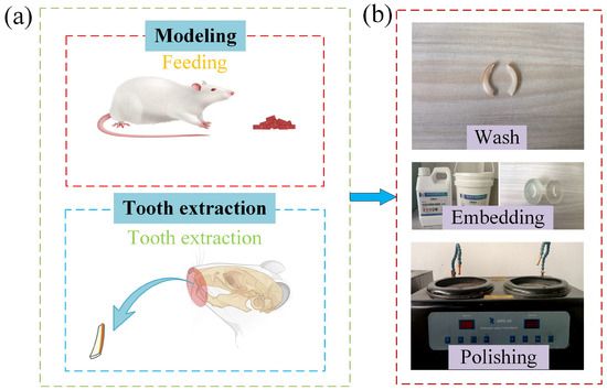 Rat modeling and sample preparation. (a) Rat modeling method; (b) Tooth sample preparation procedure. (Source: Authors own work).