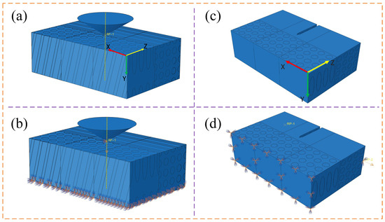 Three-dimensional structures under various boundary conditions. (a) Indentation model; (b) Boundary conditions for indentation simulation; (c) Crack model; (d) Boundary conditions for crack simulation. (Source: Authors own work).