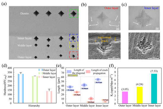 Comparison of the mechanical properties of enamel from the outer to the inner layer. (a) Indentation points at different levels on the distal surface of the incisors, arranged from the outer to the inner side; (b) A magnified image showing the surface scratches on the outer layer of tooth enamel; (c) A magnified image depicting the depressions in the inner layer of tooth enamel; (d) The differences in Vickers hardness among various layers; (e) The average length of the diagonal of the indentation and average length of crack propagation; (f) Fracture toughness of different layers. (Source: Authors own work).