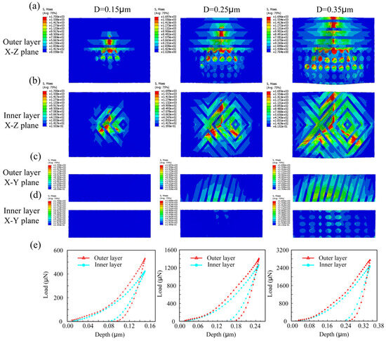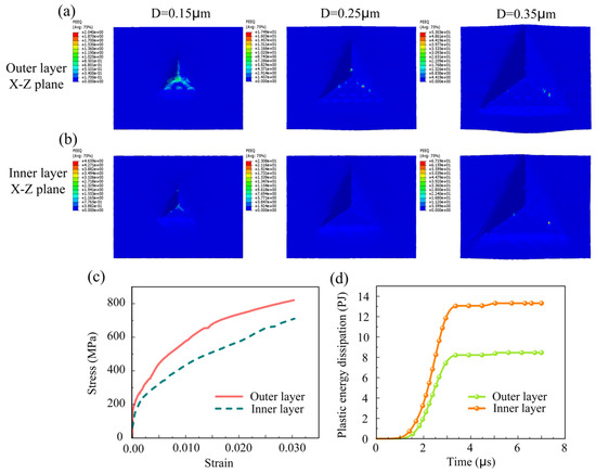 As shown in Figure 7a,b, the strain maps of the outer layer and the inner layer after being pressed into the XZ plane with thicknesses of 0.15 μm, 0.25 μm, and 0.35 μm are presented. It can be observed that as the pressing head descends, the pressed area in both the outer layer and the inner layer continuously expands. Secondly, the maximum equivalent plastic strains corresponding to the outer layer are 2.04, 17.49, and 53.03, while those corresponding to the inner layer are 4.66, 23.08, and 67.19. From this, it can be inferred that the inner layer consistently exhibits greater maximum deformation than the outer layer, suggesting that the inner layer possesses higher toughness.