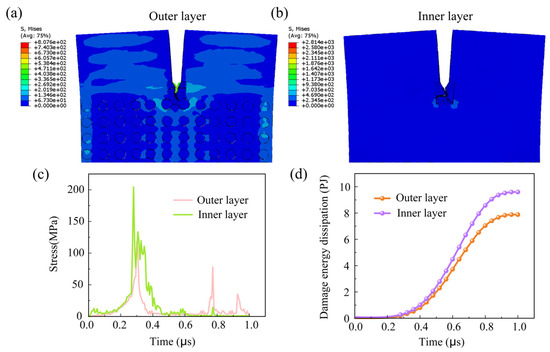 Figure 8d assesses the variation pattern of energy dissipation due to inner and outer crack damage over time, utilizing the energy dissipation ratio to construct a nonlinear statistical damage constitutive model. In the Abaqus software, the ALLDMD variable is utilized to track the energy dissipation resulting from material damage, particularly due to crack formation. Specifically, when cracks emerge within the material, the formation and propagation of these cracks are accompanied by energy dissipation, and this energy loss is primarily associated with the material’s fracture process. As can be seen from the figure, the energy dissipation curve of inner layer over time, the crack damage in the inner layer is significantly higher than that in the outer layer. This suggests that during the crack propagation process, the inner layer absorbs more energy, which leads to energy loss. The observed energy loss is intrinsically linked to the material’s fracture toughness, as evidenced by studies on microcracked materials and the impact of matrix properties on crack propagation. Materials exhibiting superior fracture toughness are capable of absorbing increased energy levels during crack propagation, thereby demonstrating enhanced resistance to crack propagation.