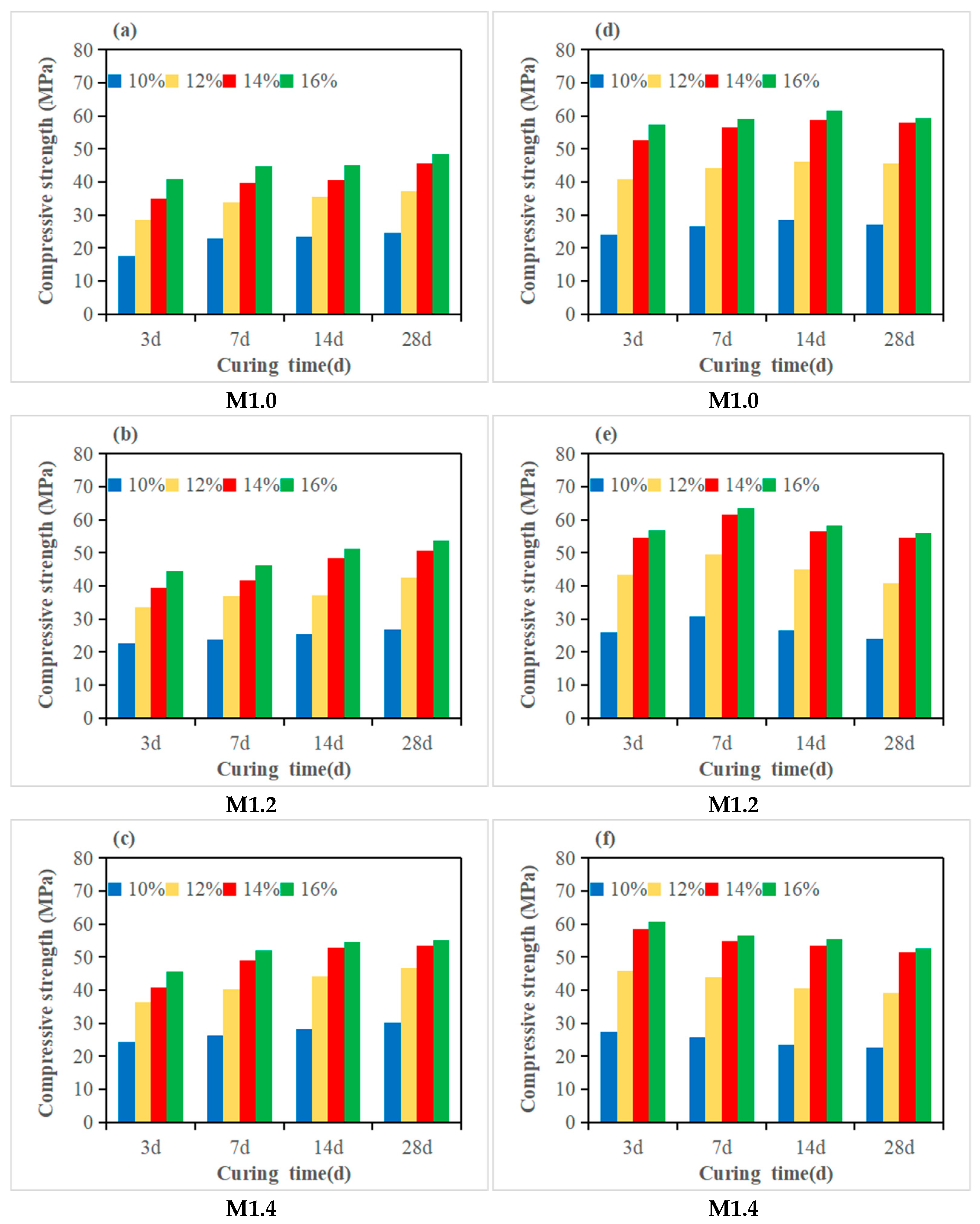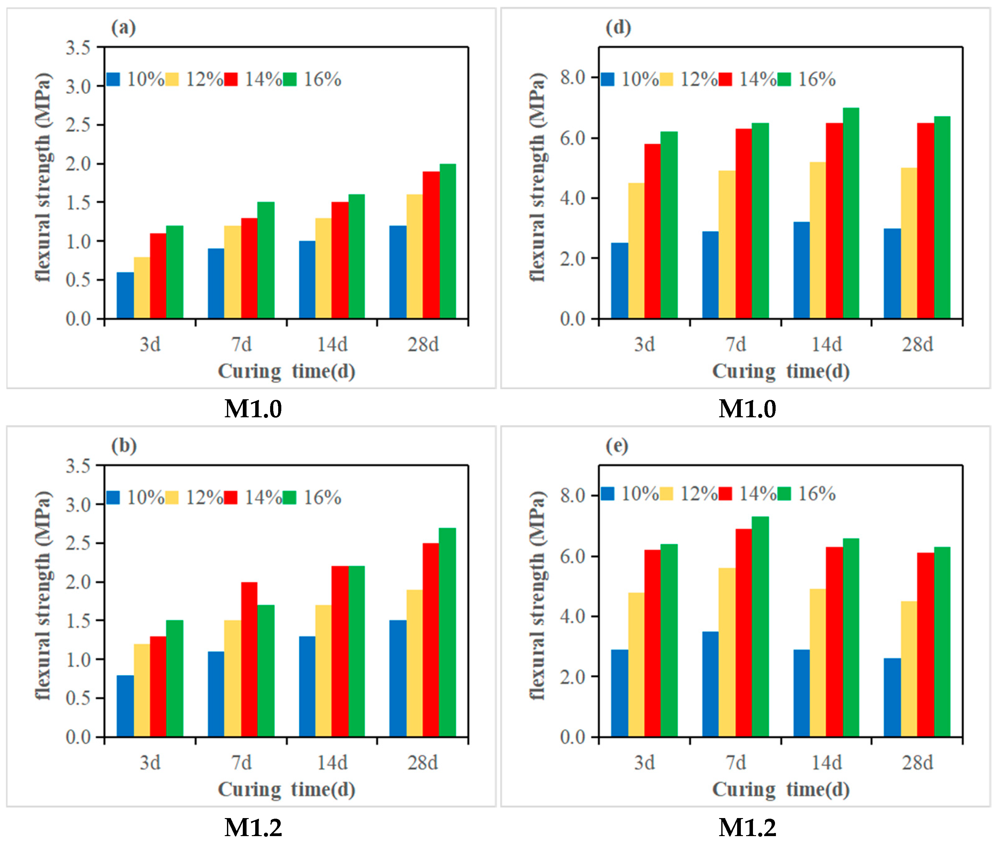 - The molar ratio n(SiO2)/n(Al2O3) is a critical factor influencing geopolymer strength. Under fixed-modulus conditions, the effect of Na2O on strength becomes particularly pronounced. For high-metakaolin-based geopolymers, both flexural and compressive strengths increase continuously with n(SiO2)/n(Al2O3) ratios ranging from 2.47 to 2.97 and Na2O equivalents ranging from 10% to 16%, indicating that neither parameter has reached its critical threshold. When the n(SiO2)/n(Al2O3) ratio of fly ash- and slag-modified metakaolin reaches 3.28, the 28-day flexural and compressive strengths attain maximum values of 7.3 MPa and 63.5 MPa, respectively.