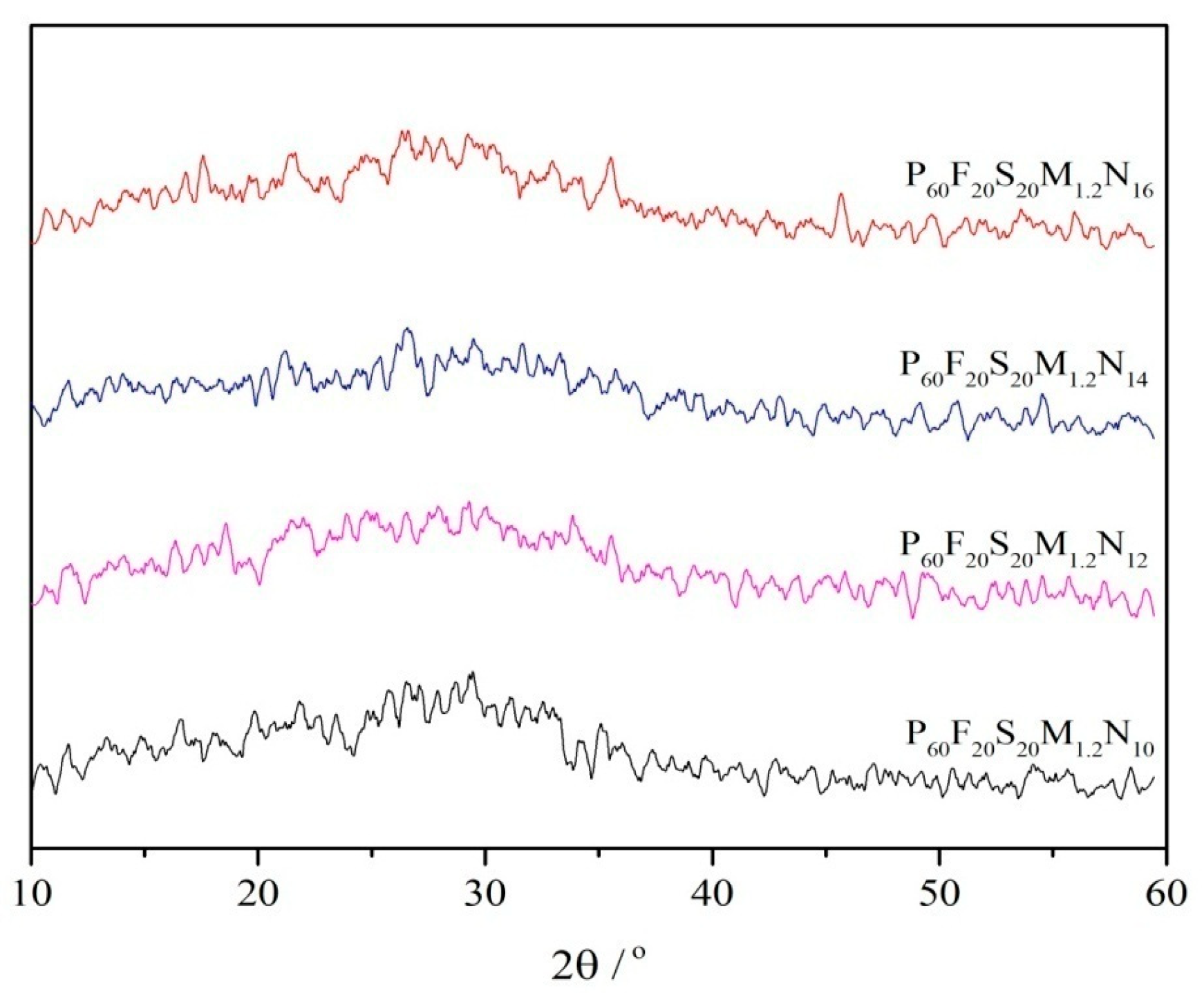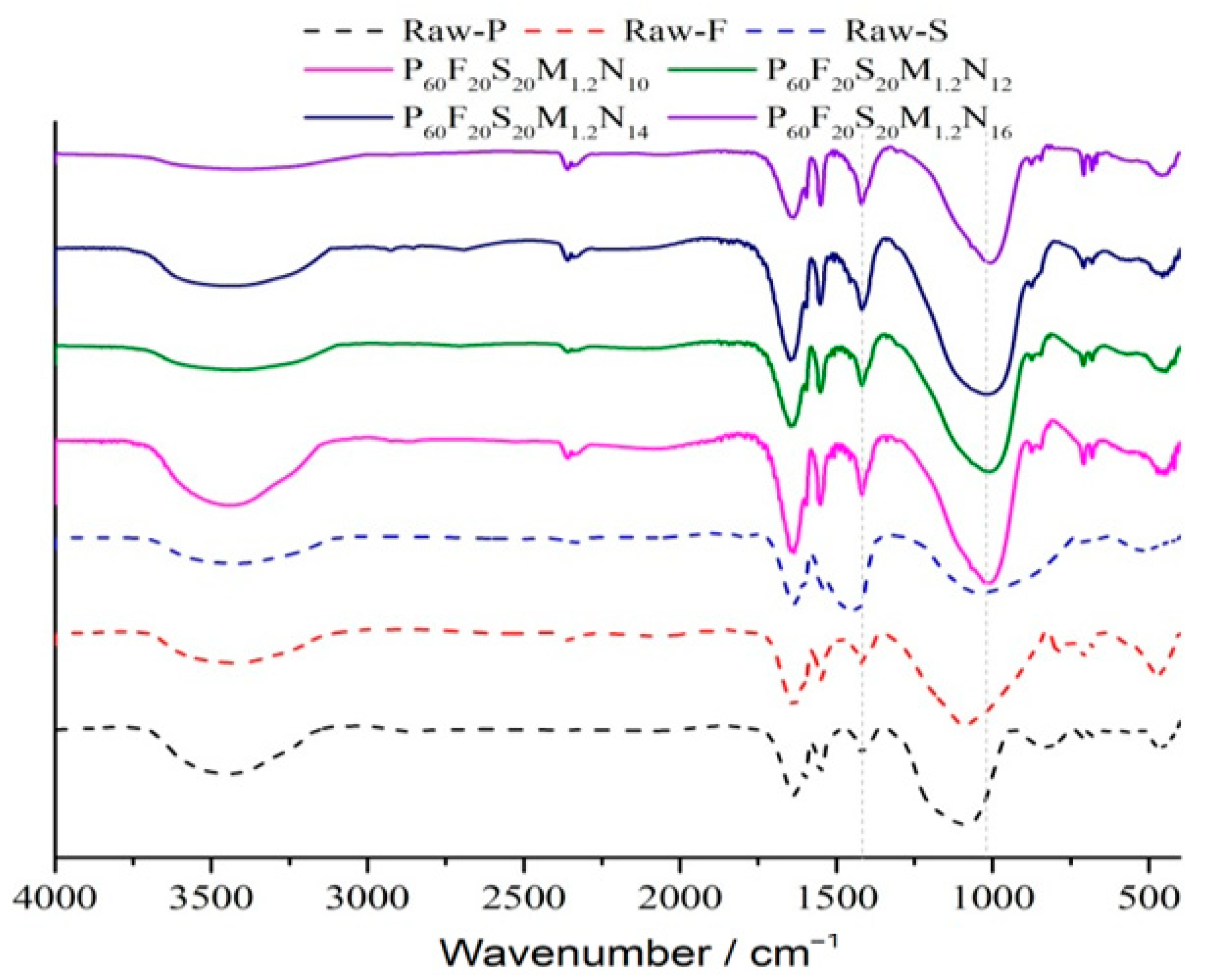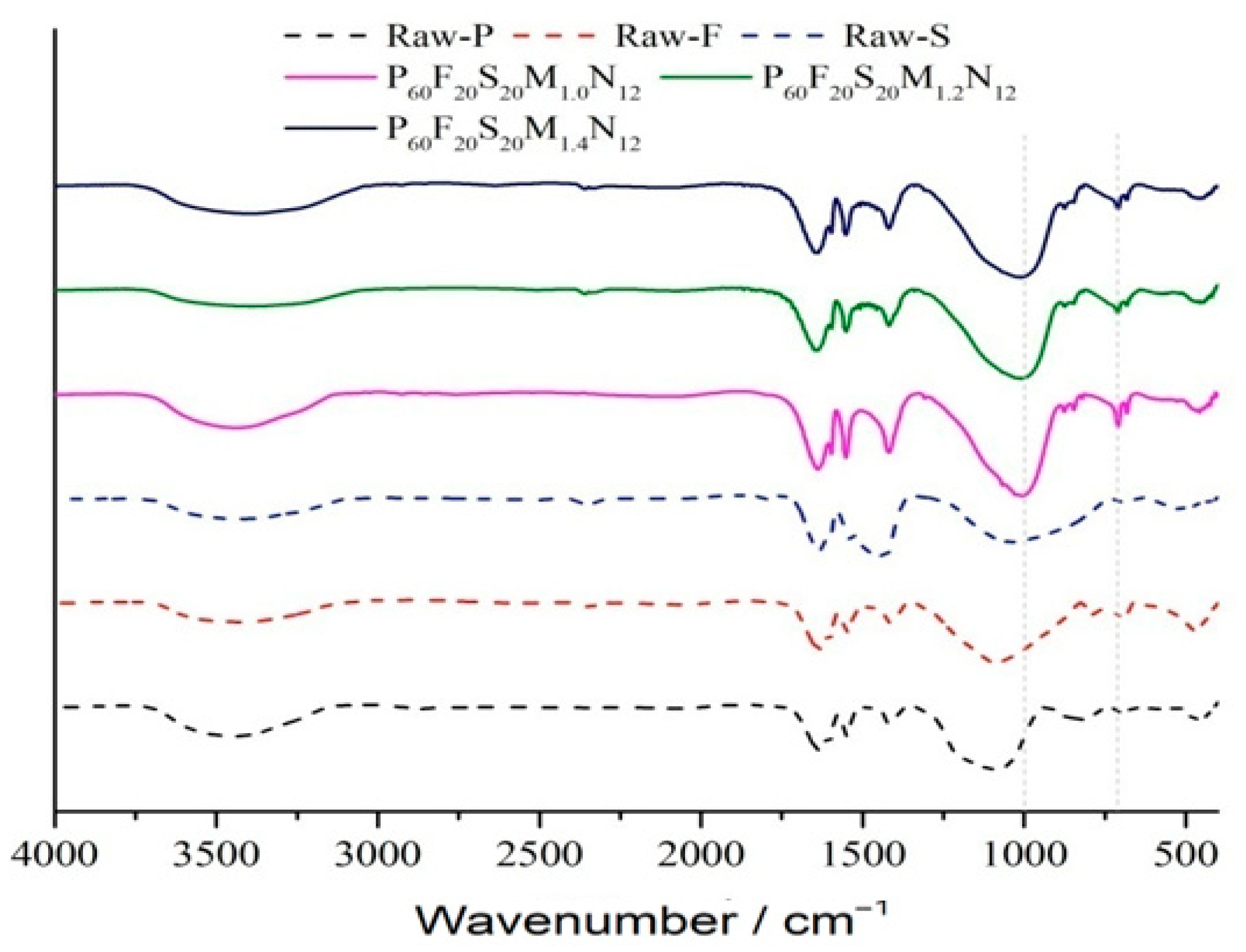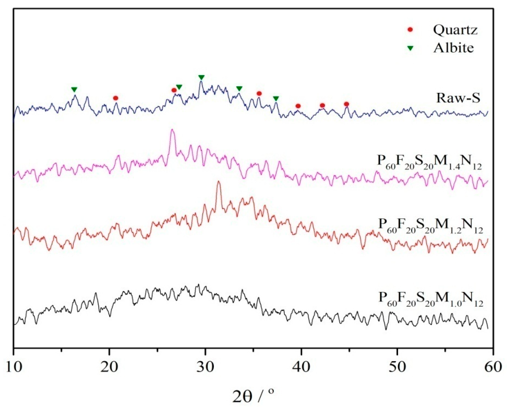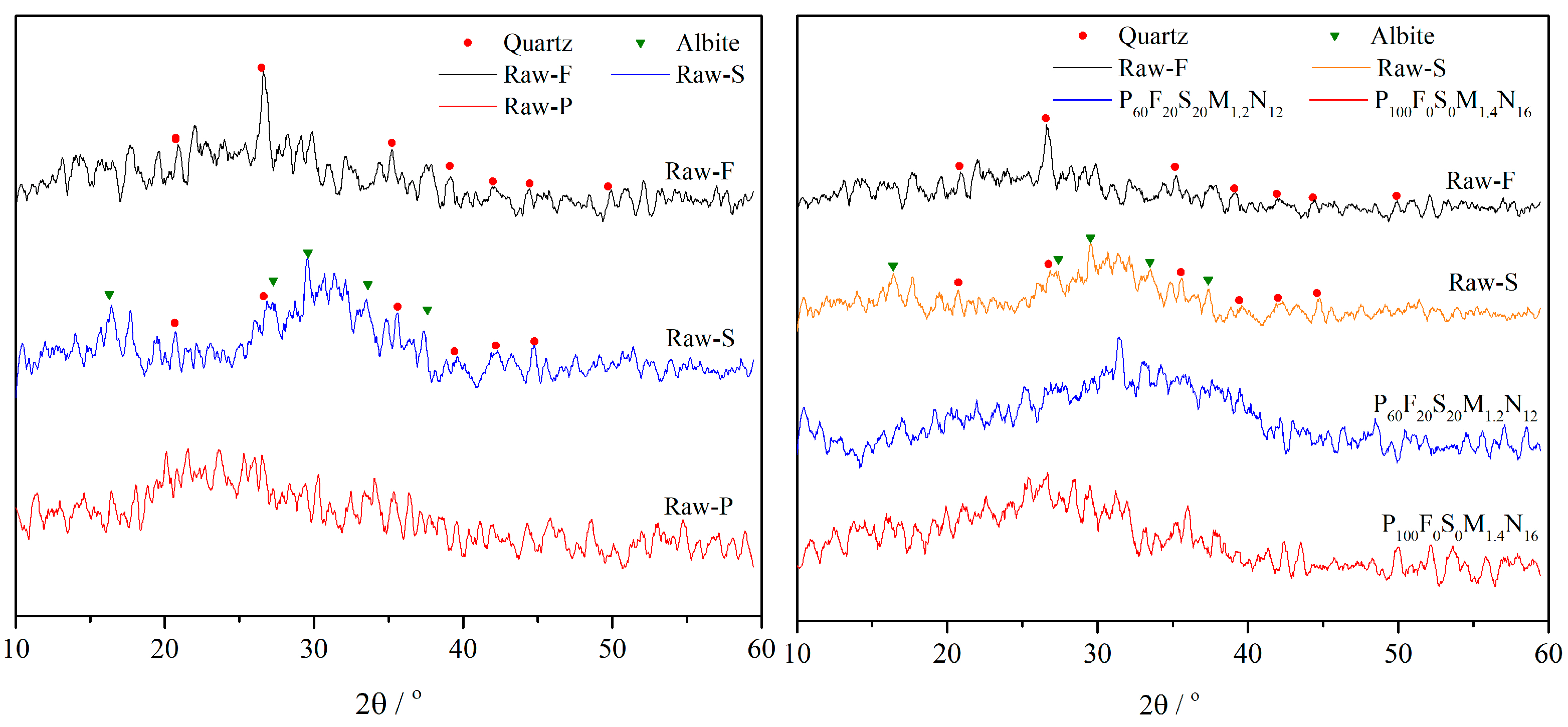 - Using the fly ash and slag–metakaolin geopolymers with the best mechanical performance as a case study, XRD analysis demonstrates that the P60F20S20M1.2N12 geopolymer exhibits minimal characteristic peaks of quartz and albite, indicating a highly complete polymerization reaction. This leads to the formation of a substantial amount of amorphous silicate gel with excellent inter-gel bonding, resulting in optimal mechanical properties. FTIR analysis further confirms that this formulation exhibits the strongest relative Si-O-T absorption peak, the highest degree of geopolymerization, the most effective alkali activation, and, consequently, the greatest mechanical strength.