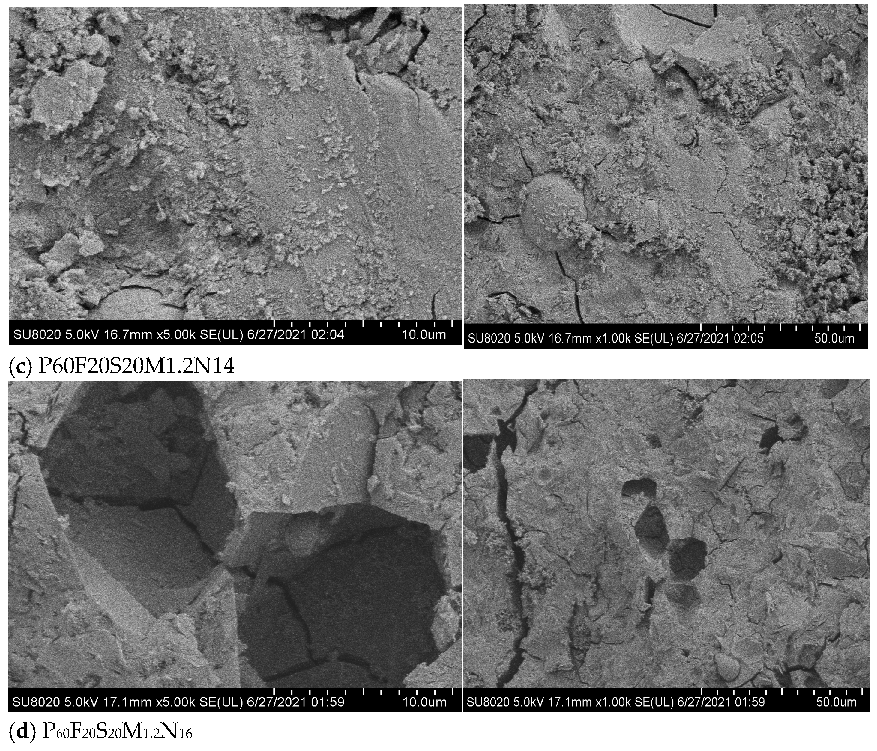 - Based on XRD and FTIR spectral analyses, two optimal geopolymer formulations—P100F0S0M1.4N16 and P60F20S20M1.2N12—are identified under varying proportions of high-alkali metakaolin, fly ash, and slag. Shifts in the characteristic absorption peaks of metakaolin, fly ash, and slag confirm the occurrence of the geopolymerization reaction and the formation of geopolymer gels. SEM analysis further reveals that the P60F20S20M1.2N12 formulation exhibits the most compact microstructure and superior mechanical properties.