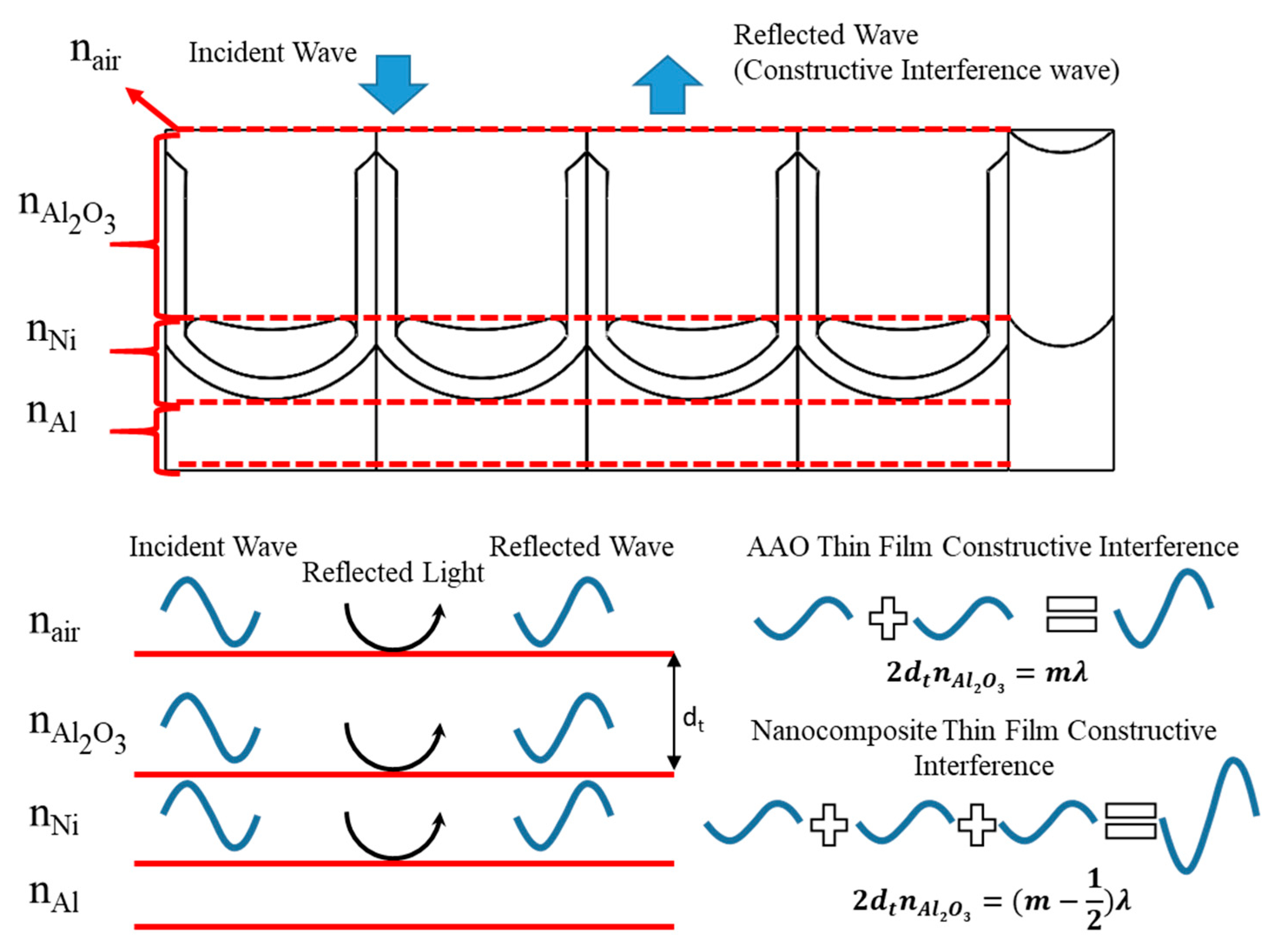 - Wang, H.; Huang, L.; Zhang, Y.; Cai, Y.; Cheng, L.; Zhai, L.; Liu, Y.; Zhang, X.; Zhu, J. Vivid reflective color generation mechanism in Al/AAO/Al configuration. Opt. Mater. Express 2022, 12, 2270–2282. [Google Scholar] [CrossRef]