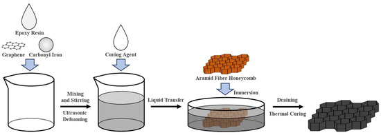 The solution blending method was used. Epoxy resin, CIP, and graphene in certain proportions were mixed. Stirring was performed at 900 rpm for 1 h at room temperature using an overhead stirrer. After the sample was uniformly mixed, it was transferred and subjected to 15 min of ultrasonic treatment. Subsequently, the D400 curing agent was added at an epoxy-to-curing agent mass ratio of 6:10, followed by mechanical stirring for 30 min. After uniform mixing, another 15 min ultrasonic treatment was performed. The mixture was transferred to a Petri dish with a radius of 15 cm. The aramid honeycomb was placed in the dish and immersed for 30 min, during which it was flipped to ensure uniform impregnation. After draining on a wire mesh, it was placed in a 100 °C oven for curing, again flipping it periodically to ensure uniformity. The experimental flowchart is shown in Figure 1, and the actual quantities of chemicals used are listed in Table 1.