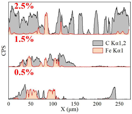 Intensity curves of C and Fe elements in samples with different graphene contents.
