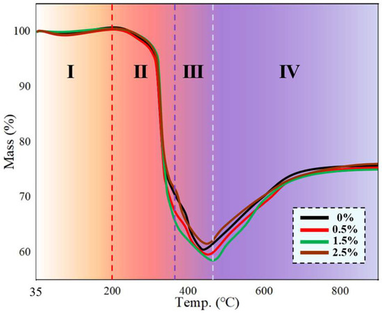 Thermogravimetric analysis curves of samples with different graphene contents, and divided into four stages based on the degree and rate of weight loss.