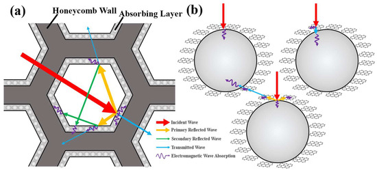 In the absorbing honeycomb structure, both sides of the aramid honeycomb walls are coated with the composite absorbent. Its structure and absorption mechanism are shown in Figure 6a. Due to the periodicity and complexity inside the honeycomb structure, incident electromagnetic waves are inevitably dispersed by the honeycomb walls. Some electromagnetic waves transmit through the honeycomb wall and continue to illuminate the next layer, while others are reflected onto surrounding honeycomb walls. Whether transmitted or reflected, the electromagnetic waves lose part of their energy when passing through the absorbent. After multiple transmission and reflection processes, the original electromagnetic wave is dispersed and absorbed within the honeycomb structure, greatly improving the utilization efficiency of the absorbent, while the overall structure benefits from being lightweight due to its structural characteristics.