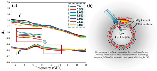 (a) Complex permeability curves of samples with different graphene contents; (b) Skin effect induced by excessive graphene.
