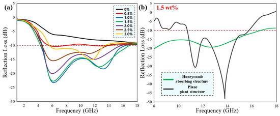 (a) Reflection loss curves of samples with different graphene contents; (b) Reflection loss curves of honeycomb structure and plane plate structure when graphene accounts for 1.5 wt.%.