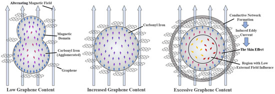 Although the overall magnetic properties of the material are still dominated by CIP, the test results indicate that the graphene content has a noticeable influence on the magnetic properties. The specific mechanism is illustrated in Figure 11. Due to the high content of CIP, the hysteresis loops of all samples exhibit high saturation magnetization and low coercivity, characteristic of soft magnetic materials. According to the M-H curves, the graphene content significantly affects the saturation magnetization (Ms) of the samples. Without graphene, the saturation magnetization was relatively low, only 84.56 emu/g. When the graphene content increased to 1.5 wt.%, the saturation magnetization reached its maximum value of 99.94 emu/g. Further increasing the graphene content led to a decrease in saturation magnetization. When the graphene content was low (0–1.5 wt.%), it adsorbed onto and dispersed the CIP surface, resulting in a more uniform distribution of CIP. This increased the effective volume fraction of magnetic particles and improved the orderliness of magnetic domain arrangement, thereby enhancing the overall magnetic response. This means that more small-sized CIP particles can be excited by the inherent natural resonance and exhibit stronger magnetic loss at the macro level. Simultaneously, the interface polarization generated between graphene and CIP promoted the concentration of the local magnetic field, indirectly improving magnetization efficiency, ultimately manifested as an increase in saturation magnetization. When the graphene content was high (2–3 wt.%), excessive graphene began to form larger conductive networks, directly hindering the transmission and cooperative arrangement of magnetic moments between CIP particles. This reduced the continuity of magnetic domains. Alternating magnetic fields also began to induce eddy currents within the conductive networks, generating opposing magnetic fields inside the CIP particles. This skin effect confined magnetization mainly to the surface of the magnetic particles, while internal magnetization was significantly disturbed. The eddy current distributed around the CIP particles will obviously affect its high-frequency magnetic response, and the different magnetization rates of each sample in the Hc image also indirectly support the existence of this interface coupling.