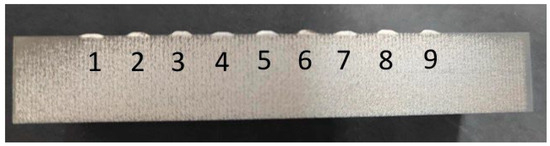 Through orthogonal experiments, various process parameters were adjusted to ultimately obtain the macroscopic morphology of the cladding layer (Figure 2). Some samples (e.g., Samples 2/3/4/7) exhibited noticeable cracks and voids, while others yielded favorable results (e.g., Sample 5). Cross-sectional views of the specimens are shown in Figure 3. Samples 1–9 represent nine distinct cladding layers, with the first layer exhibiting extremely low melt height and containing voids. As powder feed rate and scan speed increased, the second coating exhibited higher melt height but retained porosity. With further increases in powder feed rate and scan speed, the third coating maintained the same melt height but achieved greater melt width. The fourth coating, processed at lower powder feed rate and scan speed, demonstrated insufficient melt height and contained voids. The fifth coating achieves optimal melt height and width. The sixth coating exhibits relatively high melt height with adequate width. The seventh coating features further increased power but lower powder feed rate and scan speed, resulting in porosity and low melt height. The eighth and ninth coatings increase powder feed rate and scan speed, yet their melt height and width are suboptimal.