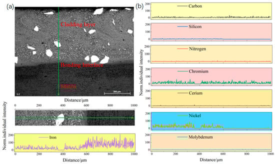 Figure 4 shows the microstructure of the bottom, middle, and top of the fusion zone of the fused cladding layer. As can be seen in Figure 4a, the cross-section of the fused cladding layer is clearly divided into the fused cladding, bonding, and matrix zones. As shown in Figure 4b, the distribution of the elements in the line scans is relatively uniform and forms a sound metallurgical bond, with no defects such as cracks and holes. The dendrites start to grow from the matrix–cladding bond and gradually extend to the interior.