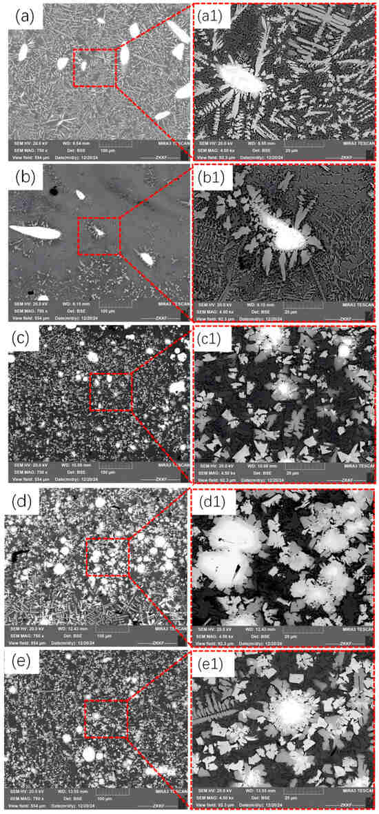 Microstructural morphology of the central region of the fused cladding layer: (a) Sample 1, (b) Sample 2, (c) Sample 3, (d) Sample 4, (e) Sample 5; and the corresponding high-magnification plot: (a1) Sample 1, (b1) Sample 2, (c1) Sample 3, (d1) Sample 4, and (e1) Sample 5 with different CeO2 contents.