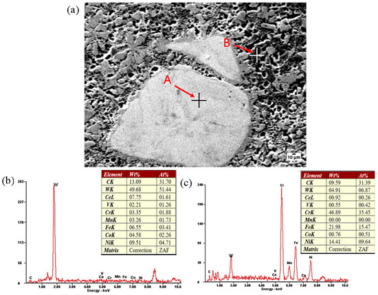 Figure 7 shows the SEM and EDS analyses of typical areas of the fused cladding layer of the specimen with a 2% CeO2 content. The main chemical components of the white blocky areas are W and carbon (C), respectively, and the main chemical compositions of the black areas are Ni, W, iron (Fe), and C. Fe is believed to be diluted out of the matrix by high-temperature melting and the relative flow of the liquid under strong laser irradiation, while W is left over from the in situ reaction and is dissolved into the Ni matrix.