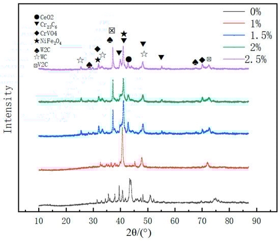 Figure 8 shows the XRD analysis of the five specimens. The variation in CeO2 content only affects the peak intensity of the coatings. This finding indicates that different CeO2 contents do not significantly change the composition of the main phase of the coatings; rather, they lead to changes in its relative proportions. Based on the distribution of the diffraction peaks, the fused cladding layers with different CeO2 contents are mainly composed of nickel iron oxide (NiFe2O4) and chromium vanadate (CrVO4) phases (with Ni from the Ni-60 powder) [22,25]. In addition, carbides such as MC (where M is W or vanadium [V]) and chromium carbide (Cr23C6) precipitate in the grain boundary space, as was the case with the energy spectrum results in Figure 7. The formation of the substances is related to their Gibbs free energy, while the precipitates are affected by the melting point. Wang [26] and Zhong [27] showed that the formation of MCs (where M stands for a specific metal element) usually exhibits a lower Gibbs free energy and a higher melting point compared to reactions that occur during laser cladding. As a result, MCs (M=W,V) tend to appear and grow gradually when the molten pool solidifies. The presence of VC and WC confirms the in situ formation of the enhanced phase in the molten pool. Sufficient Cr reacts with C to produce a large number of hard phases, Cr23C6, which precipitate upon the solidification of the molten pool. The negative Gibbs free energy of these reactions suggests that they have a tendency to occur spontaneously [28,29].