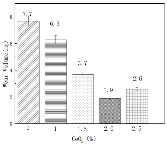 The frictional wear of the five groups of specimens with different CeO2 contents was evaluated on a testing machine for 900 s. As shown in Figure 10, the wear loss of the 0% CeO2 specimen was 0.0077 g. The weight loss of the different coatings over 15 min decreased as the amount of added CeO2 increased. The addition of CeO2 powder significantly improves the wear resistance of the fused cladding layer. This improvement is due to a preferential bias for CeO2 in the grain boundary, a stronger grain boundary effect, and a change in the grain boundary distribution that promotes enhanced dislocation mobility. At the same time, the inter-grain slip tendency increases, facilitating stress relaxation in surface microcracks under friction, enhancing resistance to crack propagation, and thereby reducing wear. Moreover, the eutectic microstructure is refined and the toughness of the fused cladding layer is improved and during the solidification phase, the excess of rare-earth elements accelerates the absorption rate of the cladding material, thereby enhancing energy within the molten pool and facilitating the release of more WC particles, resulting in enhanced hardness [32]. Hence, under frictional wear, the coating’s surface constantly produces plastic deformation, delaying the occurrence of crushing. Overall, the optimal amount of CeO2 addition is 2%.