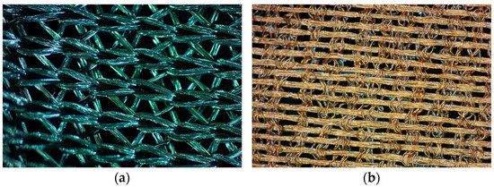 Textural views by stereo microscope: (a) PA/Ag textile; (b) PA/Cu textile. Zoom magnification is 3.2×.