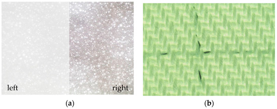 Textural views of PET/PVC and C/PES/S textiles taken with an optical microscope are shown in Figure 2. The PET/PVC textile has a smooth, white surface with evenly distributed spherical filler particles (see Figure 2a on the left), which become more visible when the brightness and contrast of the image are increased (see Figure 2a on the right). The C/PES/S textile is a woven cotton fabric in a green colour with dark spandex thread (see Figure 2b).