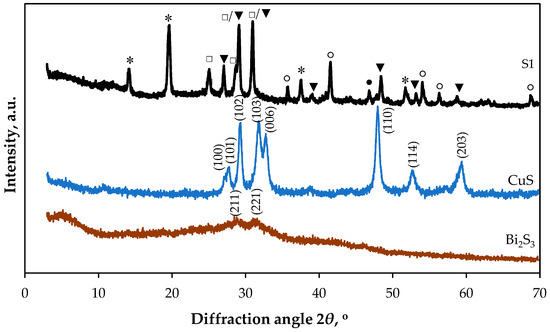 XRD diffractogram of Bi2S3 sediment, CuS sediment and sample S1. Peaks are labelled as follows: ●—rhombohedral CaCO3 (JCPDS: 05-0586); ○—tetragonal TiO2 (JCPDS: 04-006-1890); □—orthorhombic Bi2S3 (JCPDS: 17-320); ▼—hexagonal CuS (JCPDS: 78-0876); *—orthorhombic Cu3BiS3 (JCPDS: 43-1479).