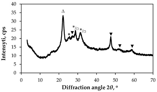 XRD diffractogram of sample S4. Peaks are labelled as follows: Δ—cellulose I (JCPDS: 03-0226); ▼—hexagonal CuS (JCPDS: 78-0876); □—orthorhombic Bi2S3 (JCPDS: 17-320); *—orthorhombic Cu3BiS3 (JCPDS: 43-1479).