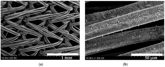 Figure 1 shows textural views of PA/Ag and PA/Cu textiles taken with a stereo microscope. PA/Ag is a knitted fabric with a metallic, silver-grey colour (Figure 1a), while PA/Cu is a woven fabric with a red-brown copper colour (Figure 1b).