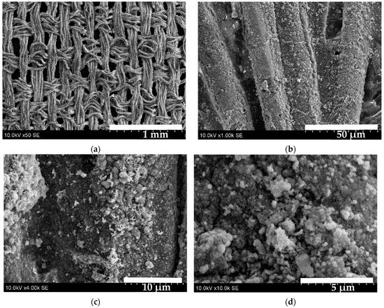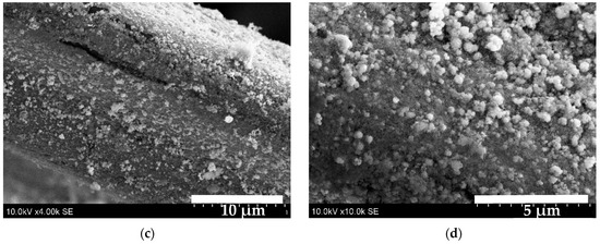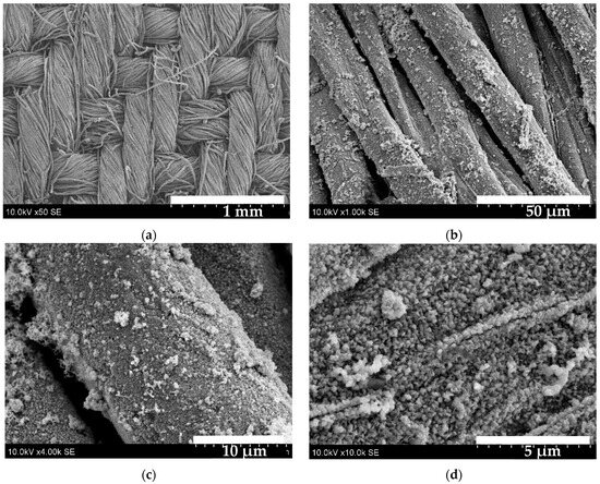 Figure 10 shows SEM images of the sample S4. These images show the complex, woven structure of the cotton fabric, with the threads and fibres clearly visible. Due to their small thickness and excellent adhesion to the fibre surface, the thin film particles on the fibre are practically invisible (image (a)). However, at higher magnification (image (b)), it can be seen that each fibre is covered in Cu–Bi sulphide particles of various sizes. While the coating may appear uneven, image (c) shows that there are no uncoated areas. Image (d) reveals individual crystallites about 100 nm of a distinctive shape that are closely spaced on the surface, as well as clusters of various sizes and shapes.