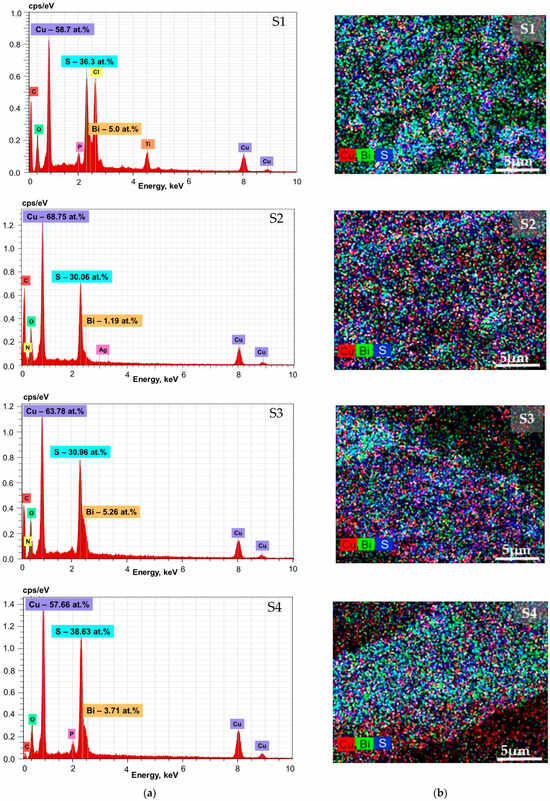 Based on chemical elemental maps (Figure 11b) of the S1 and S4 samples, copper and sulphur are evenly spread out, while some localised areas contain more bismuth, which can be attributed to the formation of larger nanocrystalline structures. S2 and S3 elemental maps suggest a more even distribution of bismuth, copper and sulphur, which attributes to a more homogeneous composite surface.