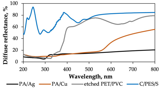 UV-Vis diffuse reflectance spectroscopy was used to characterise the optical properties of the obtained composites. This technique indirectly measures the material’s electronic structure and provides information about the electronic transitions of the different orbitals of a solid through the absorption spectra [55]. It has been reported that UV-Vis DR spectroscopy is the most effective method for evaluating the optical properties of textile fibres [62].