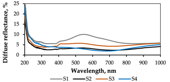 The C/PES/S textile sample consists of cotton, which reflects a substantial amount of visible light and has a highly distinctive reflectance region in the 200–400 nm range (Figure 12) [63]. The highest reflectance value of 92% is registered at around 250 nm, which is usually associated with impurities (e.g., lignin) in cellulose I. The spectrum of the S4 composite (Figure 13) shows absorption of around 97–98%, as indicated by the low reflectance value.