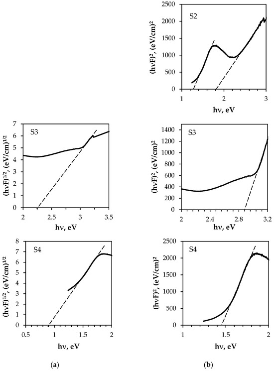 UV-Vis diffuse reflectance spectra were recorded using a Lambda 35 UV-Vis spectrophotometer (Waltham, MA, USA). Barium sulphate was used as a white standard. The Kubelka–Munk method was employed to calculate the optical energy gap (Eop), using the following equations [55,56]: